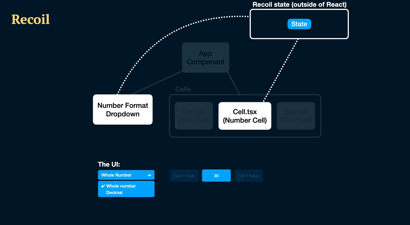 const usdAtom = atom({ key:'usd', default:1, }) const eurSelector = selector<number>({ key:"eur", get: ({get}) => { let usd = get(usdAtom); const commissionEnabled = get(commissionEnabledAtom) if(commissionEnabled){ const commission = get(commissionAtom) usd = removeCommission(usd,commission) } return usd * exchangeRate }, set:({set,get},newEurValue) => { //@ts-ignore let newUsdValue = newEurValue / exchangeRate const commissionEnabled = get(commissionEnabledAtom) if(commissionEnabled){ const commission = get(commissionAtom) newUsdValue = addCommission(newUsdValue,commission) } set(usdAtom,newUsdValue) }, }) export const Selectors = () => { const [usd, setUSD] = useRecoilState(usdAtom); const [eur,setEUR] = useRecoilState(eurSelector) return ( <div style={{padding: 20}}> <Heading size="lg" mb={2}> Currency converter </Heading> <InputStack> <CurrencyInput label="usd" amount={usd} onChange={(usd) => setUSD(usd)} /> <CurrencyInput label="eur" amount={eur} onChange={(eur) => setEUR(eur)}/> </InputStack> <Commission /> </div> ) } ... const commissionEnabledAtom = atom({ key: 'commissionEnabled', default: false, }) const commissionAtom = atom({ key: 'commission', default: 5, }) const Commission = () => { const [enabled, setEnabled] = useRecoilState(commissionEnabledAtom) const [commission, setCommission] = useRecoilState(commissionAtom) ... const addCommission = (amount: number, commission: number) => { return amount / (1 - commission / 100) } const removeCommission = (amount: number, commission: number) => { return amount * (1 - commission / 100) }